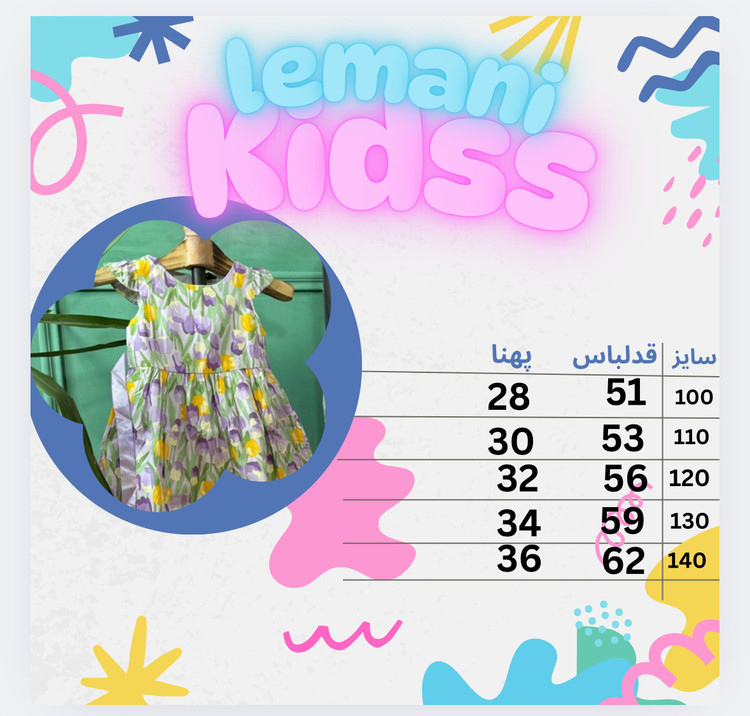! کد 09 مناسب حدود ۶سال سایز ۱۰۰قدپیراهن ۵۱ پهنا ۲۸ سایز۱۱۰قد پیراهن ۵۳پهنا ۳۰ سایز۱۲۰قدپیراهن ۵۶ پهنا ۳۲ سایز۱۳۰قدپیراهن ۵۹ پهنا ۳۴ سایز ۱۴۰قدپیراهن ۶۲ پهنا ۳۶ بها با احترام 458000t