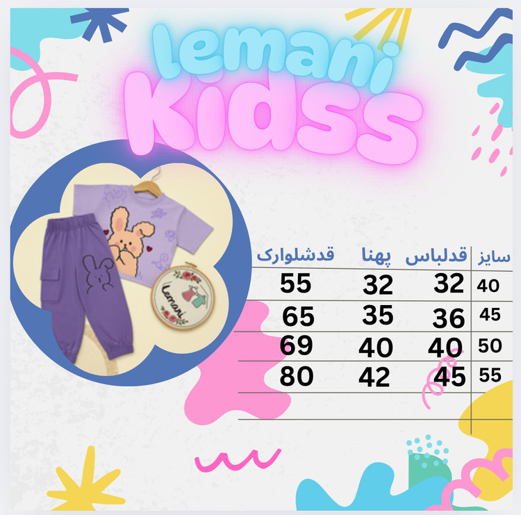 سایز 40 قد تیشرت 32…..پهنا 32…..قد شلوار 55 سایز 45 قد تیشرت 37…..پهنا 35…..قد شلوار 65 سایز 50 قد تیشرت 42.پهنا38.. ..قدشلوار 75 سایز55 قدتیشرت 47.پهنا 42.قدشلوار 85